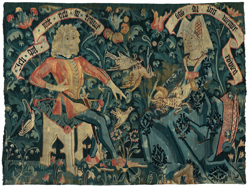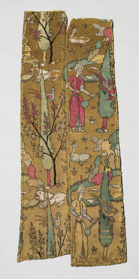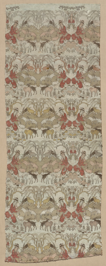 Heritage Synthesis: Section of Silk Fabric with Falconers Amid Rose Bushes