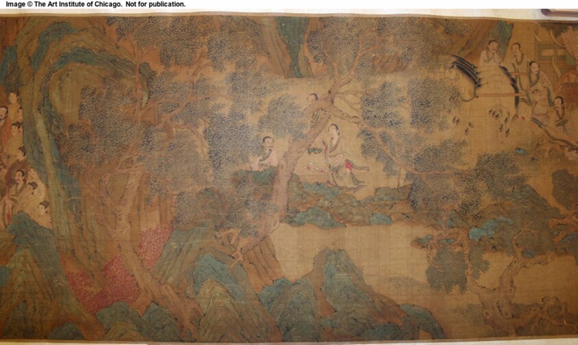 Heritage Synthesis: Wine bearers in landscape, from a robe